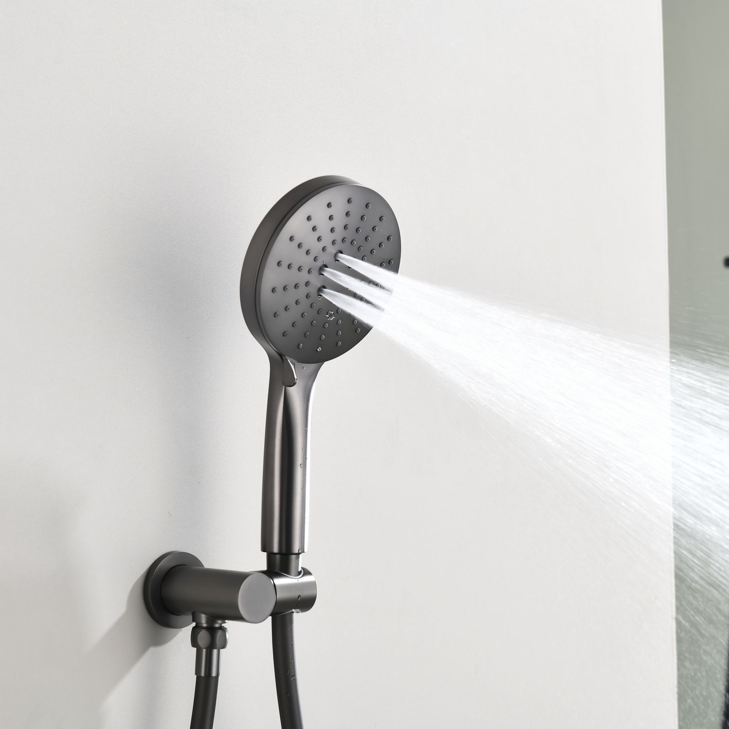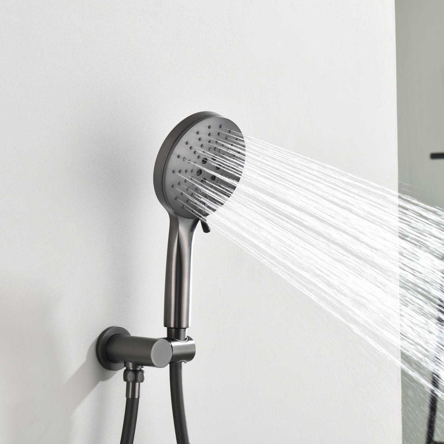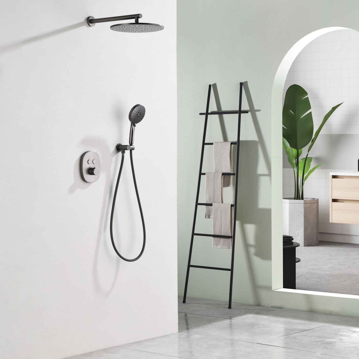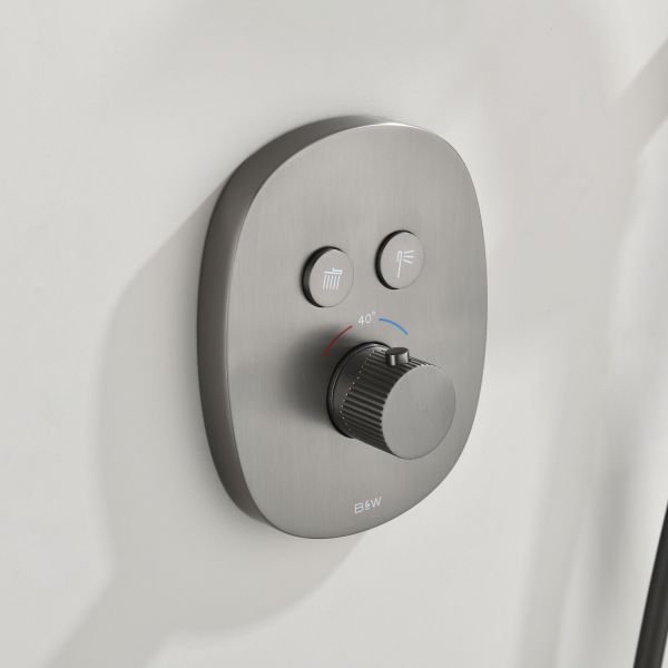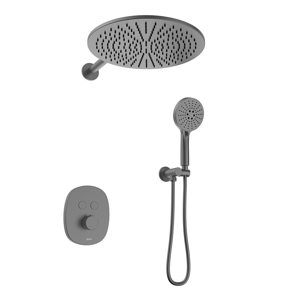 Комплект встраиваемого смесителя для душа датского производителя Black&White в цвете оружейная сталь. Корпус блока управления и смесителя выполнен в форме овала, для подачи воды и настройки температуры используется термостатический смеситель без регулировки давления. А для выбора нужного режима установлены две круглые кнопки с пиктограммами . Из потребителей доступен ручной душ с переключателями режимов и верхняя лейка на круглом кронштейне. Плавные формы корпуса смесителя и круглые лейки гармонично выпишутся в классические и минималистичные интерьеры.
