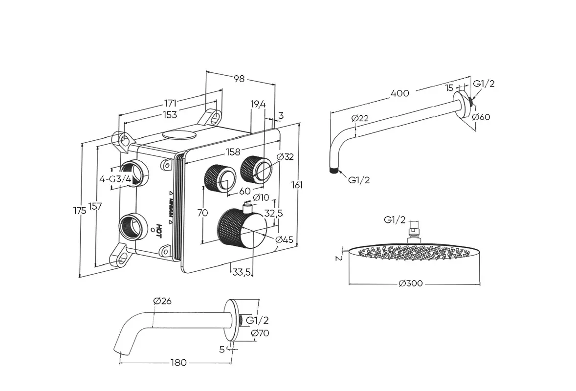 верх.диск Ø300*2 мм - нерж.сталь AISI304 на кронштене 400мм, силиконовые сопла Easy-clean, шарнирное соединение