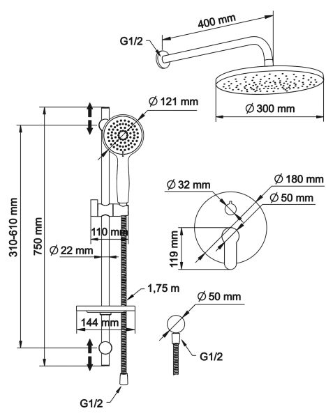 - верхний душ (душевая головка) с регулировкой наклона, настенный монтаж;