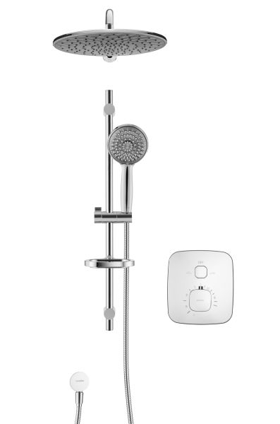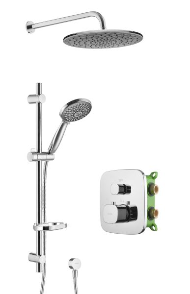 Душевой комплект со встраиваемым термостатическим смесителем на 2 выхода (в монтажном боксе), верхним душем ø300 мм и лейкой ø121 мм (3 режима). Цвет: хром, серый