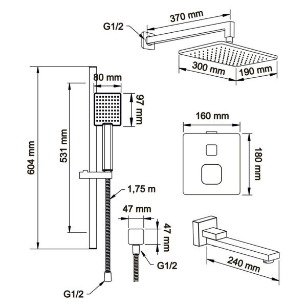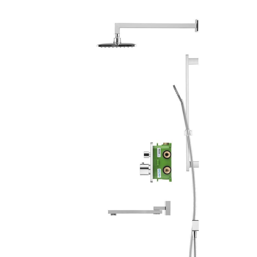 Душевой комплект со встраиваемым термостатическим смесителем на 3 выхода (в монтажном боксе), верхним душем 300х190 мм, лейкой 80х97 мм (1 режим) и поворотным изливом