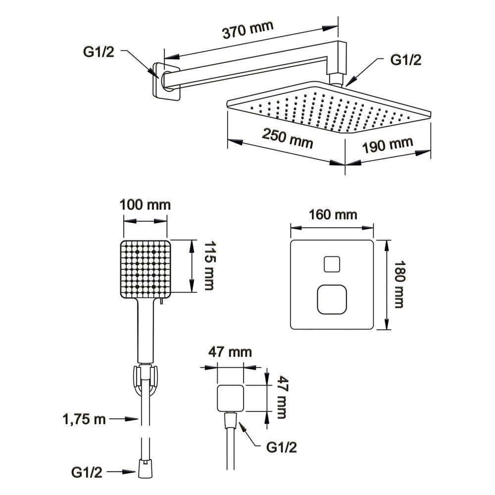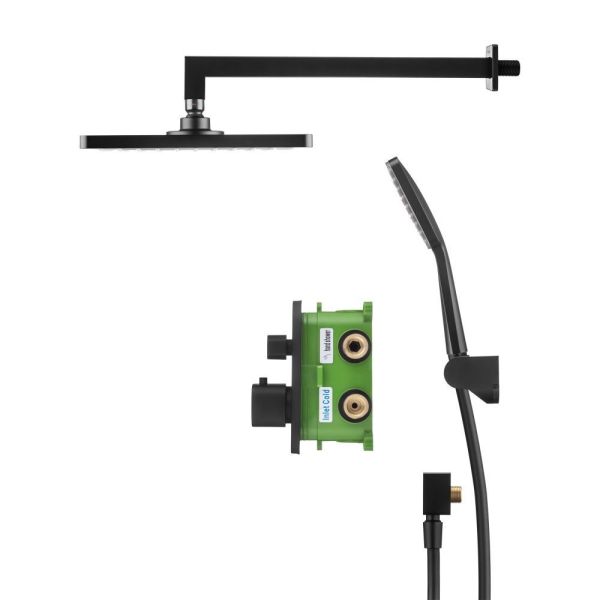 Душевой комплект со встраиваемым термостатическим смесителем на 2 выхода (в монтажном боксе), верхним душем 190х250 мм и лейкой 100х115 мм (6 режимов) цвет: черный
