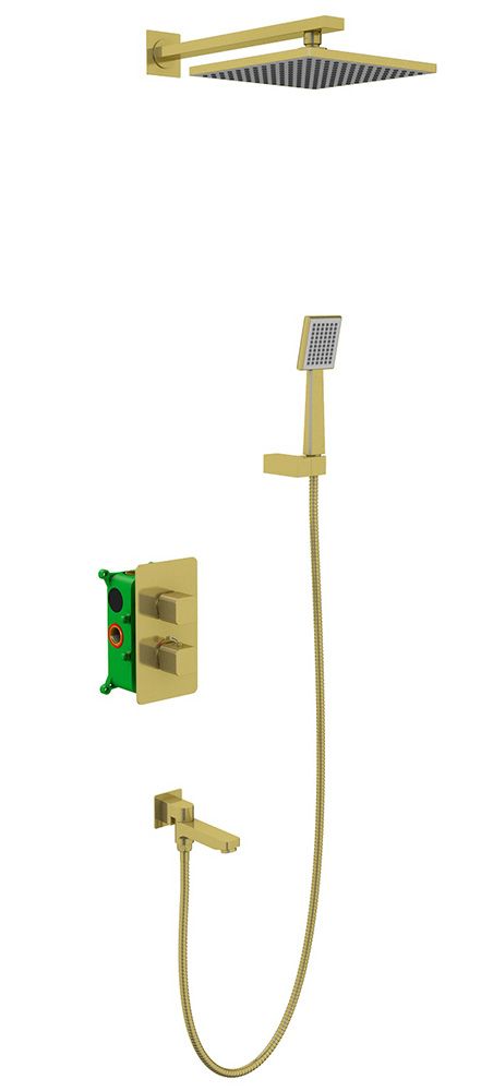 Цвет "матовое золото" никогда не выйдет из моды, во все времена драгоценный металл был признаком богатства.Душевая система с термостатом Timo Petruma 5049 относится к премиальному сегменту, предназначена для монтажа в полой или твердой стене. Термостатический картридж поддерживает стабильную температуру воды, обеспечивая максимально комфортные условия для принятия водных процедур. Основные преимущества встроенной системы: элегантный внешний вид, все коммуникации и крепления спрятаны в стену снаружи видны только декоративные элементы. Установить встроенную систему можно в любом месте. Использовать такой смеситель очень удобно, регулировка температуры воды осуществляется ручкой термостата (расположена снизу). Включение режима "тропический душ" и увеличение напора осуществляется поворотом ручки дивертора (расположена сверху) влево. Регулируя напор воды в режиме "тропический душ" можно получить массажное воздействие различной интенсивности. Для переключения в режим "излив" верните ручку дивертора в исходное положение 12:00 (смеситель выключен), а затем поверните вправо. Увеличение напора воды осуществляется поворотом ручки вправо. Для включения режима "ручной душ" поверните излив к стене. Сложностей монтажа не возникает при установке элементов душевой системы опытным сантехником. Внимательно изучите инструкцию по монтажу и эксплуатации.