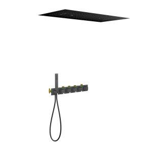 Черная сантехника становится все более популярной для ванных комнат из-за способности расставлять акценты.Встраиваемая душевая система с термостатом Timo Petruma 5329 относится к премиальному сегменту, предназначена для монтажа в полой или твердой стене. Термостатический картридж поддерживает стабильную температуру воды, обеспечивая максимально комфортные условия для принятия водных процедур. Встроенный потолочный душ большого размера создает имитацию проливного дождя, вода обливает человека целиком. Регулируя напор воды можно получить массажное воздействие, что очень полезно для здоровья. Основные преимущества встроенной системы: элегантный внешний вид, все коммуникации и крепления спрятаны в стену и потолок, снаружи видны только декоративные элементы. Установить встроенную систему можно в любом месте. Сложностей монтажа не возникает при установке элементов душевой системы опытным сантехником. Внимательно изучите инструкцию по монтажу и эксплуатации.Черная сантехника требует бережного ухода.
