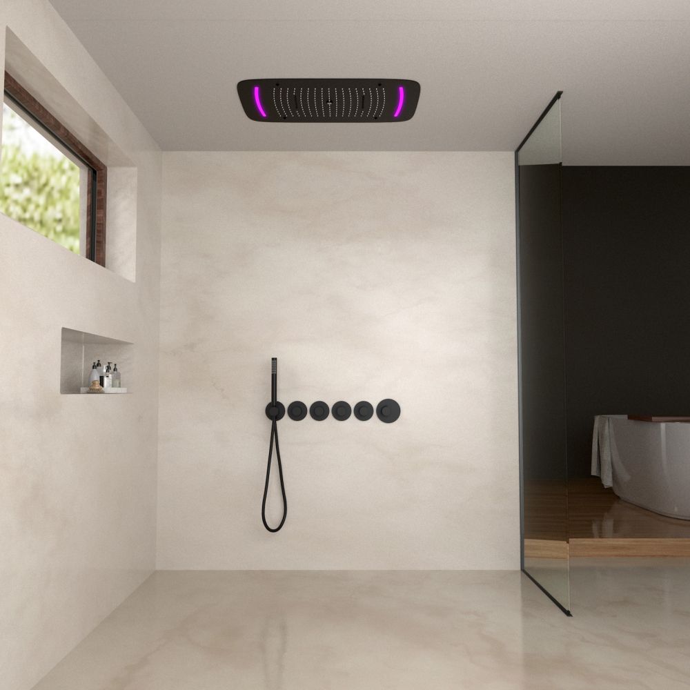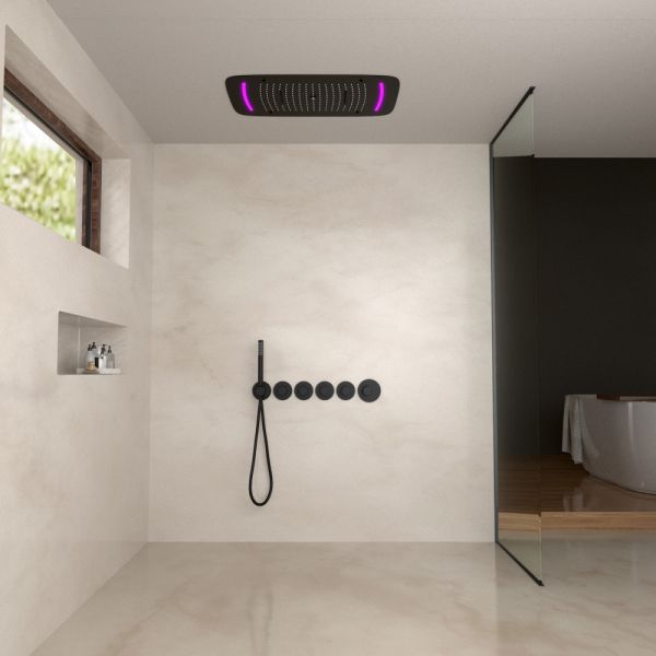 Черная сантехника становится все более популярной для ванных комнат из-за способности расставлять акценты.Встраиваемая душевая система с термостатом Timo Saona 2319 относится к премиальному сегменту, предназначена для монтажа в полой или твердой стене. Термостатический картридж поддерживает стабильную температуру воды, обеспечивая максимально комфортные условия для принятия водных процедур. Встроенный потолочный душ большого размера создает имитацию проливного дождя, вода обливает человека целиком. Регулируя напор воды можно получить массажное воздействие, что очень полезно для здоровья. Основные преимущества встроенной системы: элегантный внешний вид, все коммуникации и крепления спрятаны в стену и потолок, снаружи видны только декоративные элементы. Установить встроенную систему можно в любом месте. Сложностей монтажа не возникает при установке элементов душевой системы опытным сантехником. Внимательно изучите инструкцию по монтажу и эксплуатации.Черная сантехника требует бережного ухода.