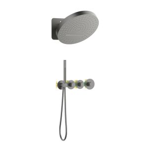 "Черное золото" неизменно эффектный и привлекающий внимание цвет. Приглушенный мягкий оттенок черного, подчеркивает форму раковины или цвет мебели.Душевая система с термостатом Timo Saona 2329 относится к премиальному сегменту, предназначена для монтажа в полой или твердой стене. Термостатический картридж поддерживает стабильную температуру воды, обеспечивая максимально комфортные условия для принятия водных процедур. Настенный душ с двумя режимами позволяет принимать водные процедуры в зависимости от настроения. Регулируя напор воды можно получить массажное воздействие различной интенсивности. Используя режим "каскад"- получают седативное (успокаивающее) воздействие на затылочную часть головы или шейный отдел. Основные преимущества встроенной системы: элегантный внешний вид, все коммуникации и крепления спрятаны в стену, снаружи видны только декоративные элементы. Установить встроенную систему можно в любом месте. Использовать такой смеситель очень удобно, регулировка температуры воды осуществляется ручкой термостата (расположена справа). Переключение режимов "каскад", "тропический душ", "ручной душ" и увеличение напора осуществляется поворотом ручек диверторов расположенных слева от термостата. В положении ручек диверторов в положение 12:00 (смеситель выключен). Смеситель может работать в нескольких режимах одновременно"каскад"+"ручной душ", "тропический душ"+"ручной душ". Сложностей монтажа не возникает при установке элементов душевой системы опытным сантехником. Внимательно изучите инструкцию по монтажу и эксплуатации. Цвет "черное золото" не капризен в уходе, на нем менее заметны загрязнения и мелкие царапины.