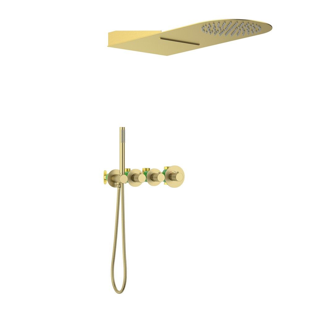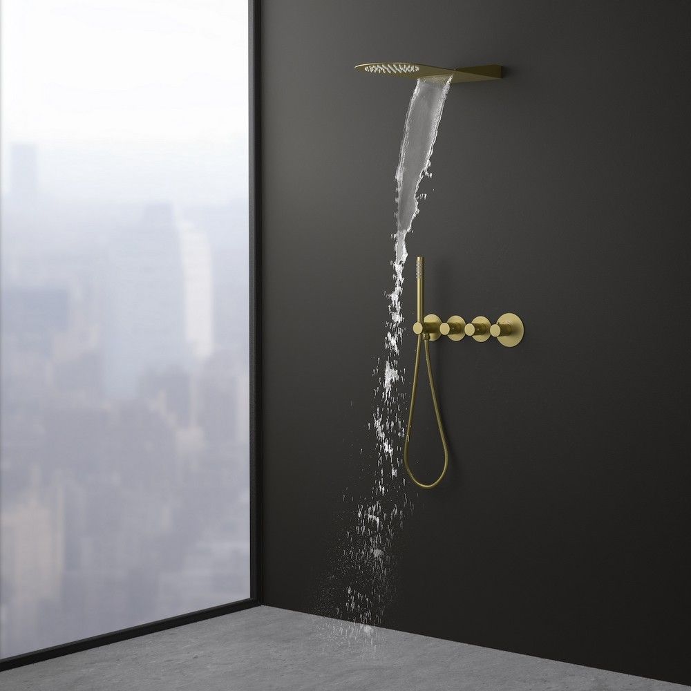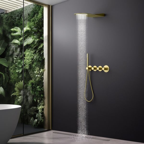 Цвет "матовое золото" никогда не выйдет из моды, во все времена драгоценный металл был признаком богатства.Душевая система с термостатом Timo Saona 2350 относится к премиальному сегменту, предназначена для монтажа в полой или твердой стене. Термостатический картридж поддерживает стабильную температуру воды, обеспечивая максимально комфортные условия для принятия водных процедур. Настенный душ с двумя режимами позволяет принимать водные процедуры в зависимости от настроения. Регулируя напор воды можно получить массажное воздействие различной интенсивности. Используя режим "каскад"- получают седативное (успокаивающее) воздействие на затылочную часть головы или шейный отдел. Основные преимущества встроенной системы: элегантный внешний вид, все коммуникации и крепления спрятаны в стену, снаружи видны только декоративные элементы. Установить встроенную систему можно в любом месте. Использовать такой смеситель очень удобно, регулировка температуры воды осуществляется ручкой термостата (расположена справа). Переключение режимов "каскад", "тропический душ", "ручной душ" и увеличение напора осуществляется поворотом ручек диверторов расположенных слева от термостата. В положении ручек диверторов в положение 12:00 (смеситель выключен). Смеситель может работать в нескольких режимах одновременно"каскад"+"ручной душ", "тропический душ"+"ручной душ". Сложностей монтажа не возникает при установке элементов душевой системы опытным сантехником. Внимательно изучите инструкцию по монтажу и эксплуатации.