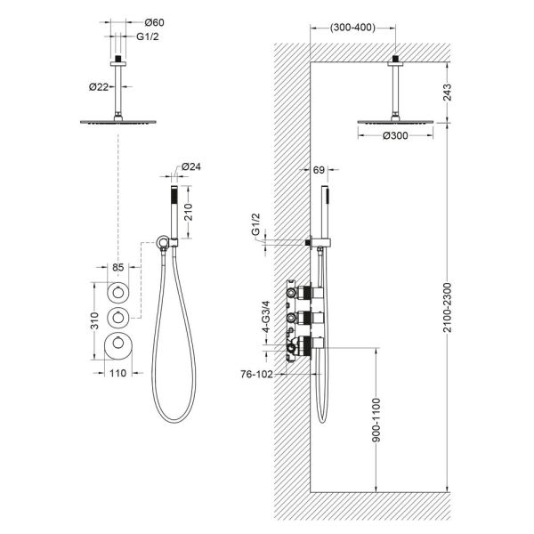 Черная сантехника становится все более популярной для ванных комнат из-за способности расставлять акценты.Душевая система с термостатом Saona 2399 относится к премиальному сегменту, предназначена для монтажа в полой или твердой стене. Верхний душ с вертикальным потолочным креплением выполнен из латуни. Термостатический картридж поддерживает стабильную температуру воды, обеспечивая максимально комфортные условия для принятия водных процедур. Регулируя напор воды в режиме "тропический душ" можно получить массажное воздействие различной интенсивности. Основные преимущества встроенной системы: элегантный внешний вид, все коммуникации и крепления спрятаны в стену, снаружи видны только декоративные элементы. Установить встроенную систему можно в любом месте. Регулировка температуры воды осуществляется ручкой термостата (расположена снизу). Включение режима "тропический душ" и регулировка напора осуществляется поворотом ручки дивертора (расположена сверху) влево. В положении ручки дивертора 12:00 режим "тропический душ" выключен. Для переключения в режим "ручной душ" поверните ручку дивертора (расположена по центру) от 12:00 против часовой стрелки. Увеличение напора воды регулируется поворотом ручки влево. В положении ручки 12:00 режим "ручной душ" выключен. Сложностей монтажа не возникает при установке элементов душевой системы опытным сантехником. Внимательно изучите инструкцию по монтажу и эксплуатации. Черная сантехника требует бережного ухода.