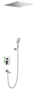Встраиваемая душевая система Selene 2039, относится к премиальному сегменту, предназначена для монтажа в полой или твердой стене. Встроенный потолочный душ большого размера создает имитацию проливного дождя, вода обливает человека целиком. Регулируя напор воды можно получить массажное воздействие, что очень полезно для здоровья. Основные преимущества встроенной системы: элегантный внешний вид, все коммуникации и крепления спрятаны в стену и потолок, снаружи видны только декоративные элементы. Установить встроенную систему можно в любом месте. Использовать такой смеситель очень удобно, регулировка напора и температуры воды осуществляется одним рычагом. Переключение режимов "тропический душ" и "излив" осуществляется поворотом ручки дивертора. Для переключения потока воды с излива на ручную лейку нужно повернуть излив к стене. Сложностей монтажа не возникает при установке элементов душевой системы опытным сантехником. Внимательно изучите инструкцию по монтажу и эксплуатации.