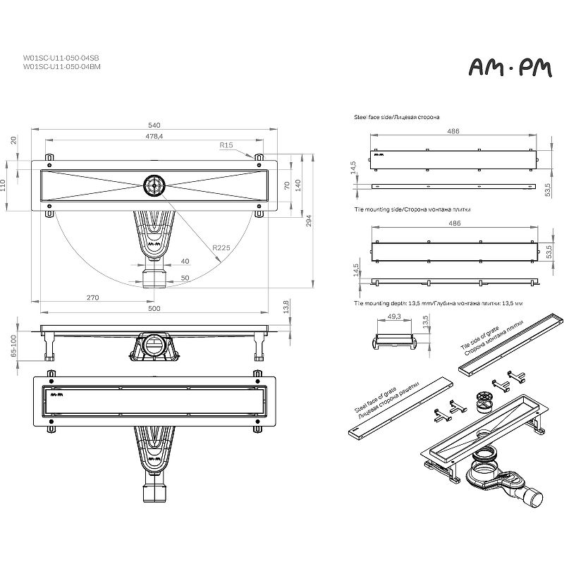 Душевой лоток AM.PM MasterFlow 50 W01SC-U11-050-04BM.Детально проработанная форма изделия, точные выверенные линии. Представляем инновационный лоток для душа Masterflow.Универсальная двухсторонняя решетка лотка может быть использована как самостоятельная декоративная вставка, либо как база для вклейки плитки.Лоток для душа имеет высокую пропускную способность 50 л/мин. Обладает комбинированным затвором: сухим магнитным и гидрозатвором. Проверенная технология гарантирует 100% защиту от проникновения запахов из канализации, высокую надежность и долговечность. Выдерживает даже самые большие механические нагрузки. Поворотный сифон на 360 градусов позволяет установить лоток наиболее удобным и комфортным образом.Продукт обладает низкой высотой монтажа и возможностью регулировки, что предполагает экономию бюджета при заливке пола. Нержавеющая сталь со специальным антикоррозийным защитным покрытием, нанесенная методом кислотной пассивации. Выход разработан на два диаметра: 40 и 50 мм, которые выбираются в процессе монтажа.Характеристики:Цвет решетки: черный матовый.