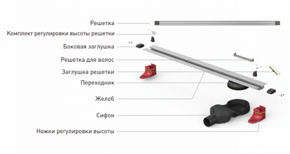 Решетка и декоративные заглушки, нержавеющая сталь AISI 304Комплект регулировки решетки по высоте от 8 до 25ммСетка для волос, пластикКомплект гидроизоляцииЖелоб водосток, нержавеющая сталь AISI 304Монтажная заглушка, пенопластРегулируемые по высоте ножки, пластикСамопромывной S-образный сифон PP:вертикальный выпуск D50/105мм H30/135мм, пропускная способность 48 л/мин, монтаж 360°Монтажный ключ, пластик