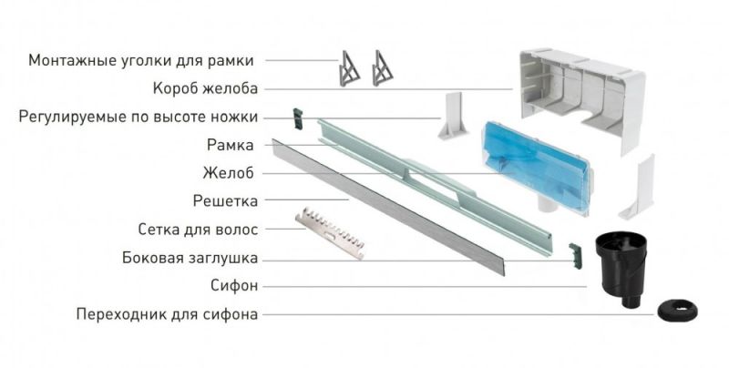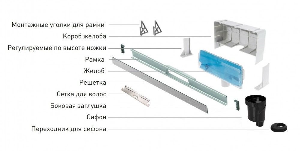 Решетка и рамка, нержавеющая сталь AISI 304Комплект регулировки рамки и монтажные углыСетка для волос, нержавеющая сталь AISI 304Комплект гидроизоляцииЖелоб водосток пристенный, PP Регулируемые по высоте ножки, пластикСамопромывной S-образный сифон с переходником PPВертикальный выпуск S-сифон D50/105мм H30/135мм, пропускная способность 42л/мин, монтаж 360°Монтажный ключ, пластик