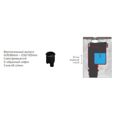 Решетка и декоративные заглушки, нержавеющая сталь AISI 304 Комплект регулировки решетки по высоте от 8 до 30мм Сетка для волос, пластик Комплект гидроизоляции Желоб водосток, нержавеющая сталь AISI 304 Монтажная заглушка, пенопласт Регулируемые по высоте ножки, пластик Самопромывной S-образный сифон PP: Вертикальный выпуск 48 л/мин , пропускная способность 42л/мин, монтаж 360° Монтажный ключ, пластик