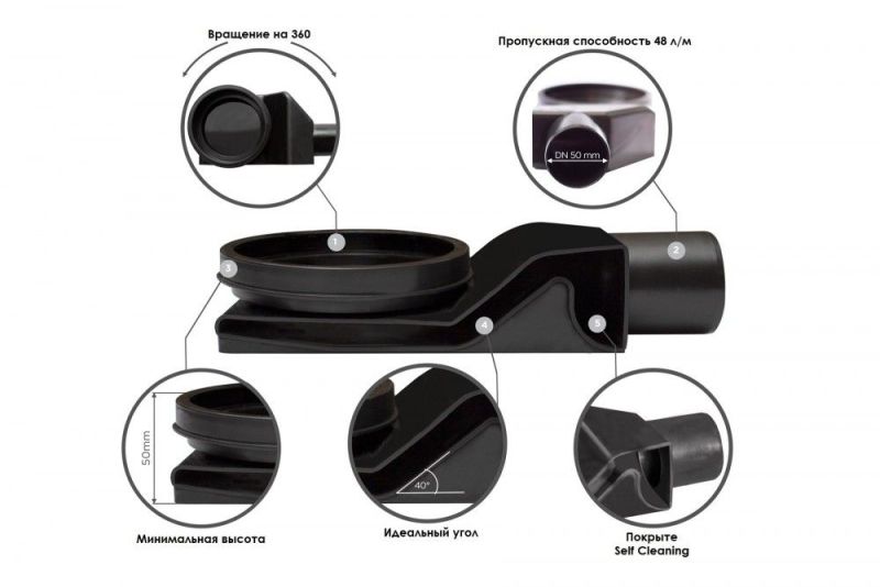 2. Материал: нержавеющая сталь AISI 304 SS дизайн-вставка, рамка; ABS корпус; PP переходник, сифон, грязеулавливающая сеточка, сухой затвор.