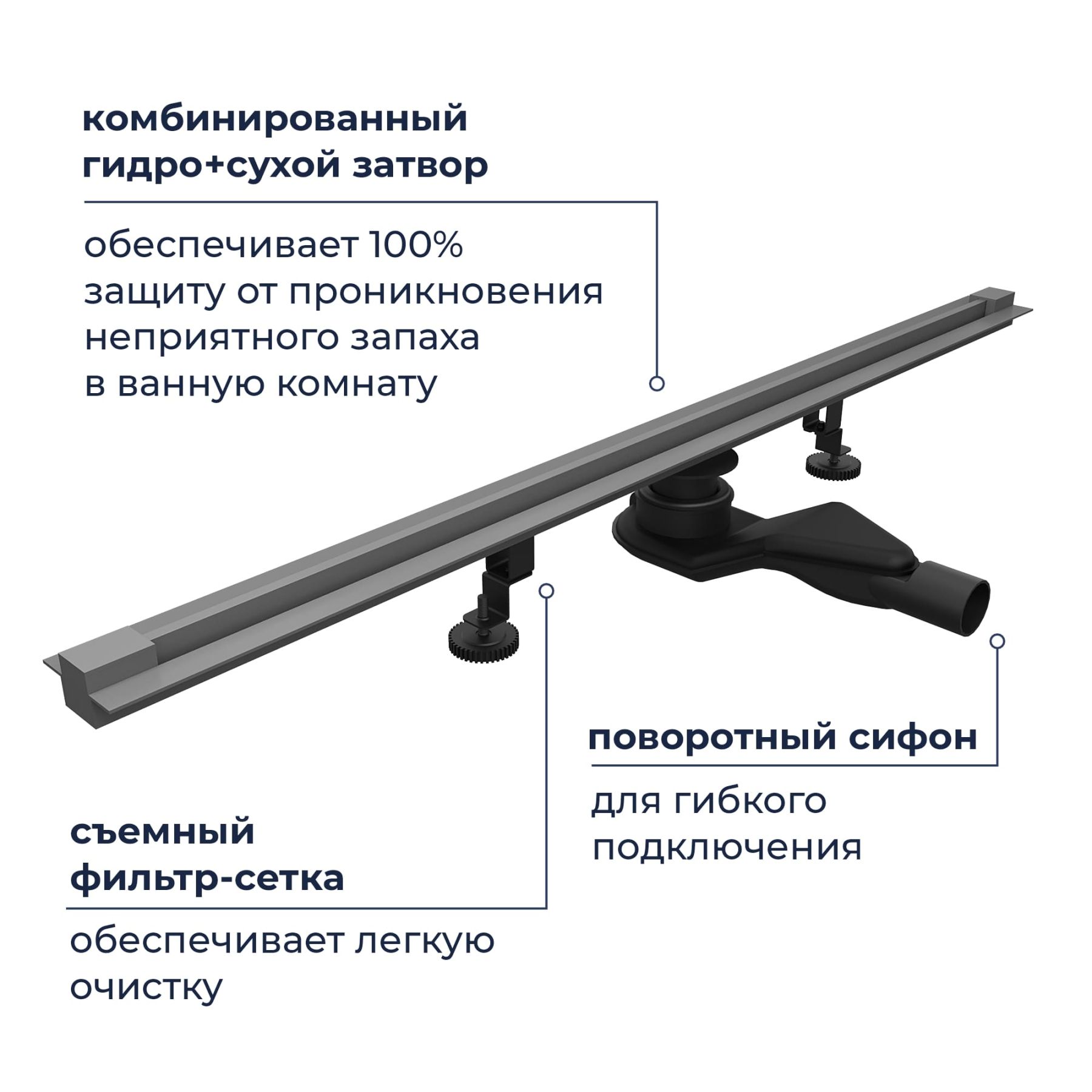 Принимающей декоративный жёлоб маскирует сливное устройство, образует щель, куда сливается вся вода из душевого пространства. Для того чтобы вода эффективно отводилась в трап, на этапе монтажа необходимо обеспечить уклон облицовочной плитки в сторону принимающего жёлоба.Для доступа к технической части устройства с целью очистки необходимо извлечь среднюю часть жёлоба вместе с боковыми декоративными заглушками.Лоток выполнен из нержавеющей стали толщиной 2 мм, собирает стекающую воду и за счёт технического уклона отводит её в сетку-фильтр, которая задерживает волосы и мелкий мусор.Далее вода проходит в сифон с комбинированным затвором, Первая вода сталкивается с сухим затвором, который изготовлен из высокопрочного ABS-пластика. Затвор выполнен в виде крышки с силиконовой прокладкой, крышка открывается под давлением воды и плотно притягивается при отсутствии воды за счёт пружинного механизма, обеспечивая 100% защиту от проникновения неприятных запахов в ванную комнату из канализации.После вода проходит через сифон с гидрозатвором и сливается в канализацию.Сифон с гидрозатвором присоединяется к нижней части лотка трапа и имеет боковой отвод с поворотом на 360 градусов, что позволяет подключить канализационный сток с любой стороны.