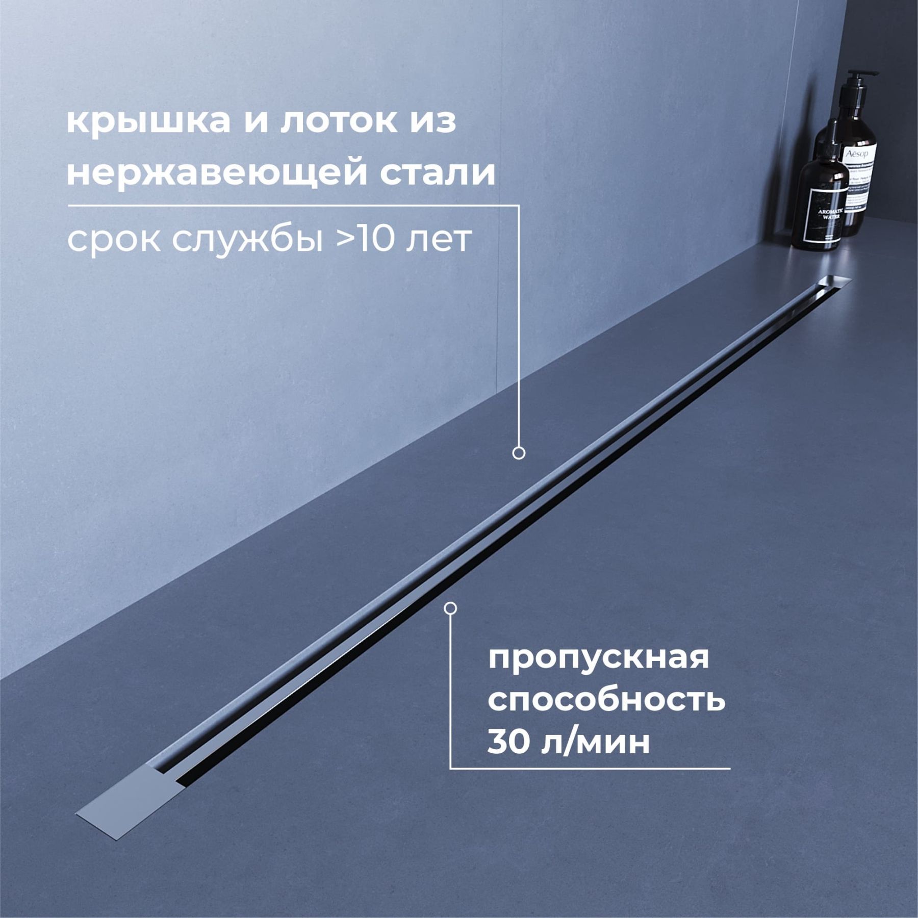Принимающей декоративный жёлоб маскирует сливное устройство, образует щель, куда сливается вся вода из душевого пространства. Для того чтобы вода эффективно отводилась в трап, на этапе монтажа необходимо обеспечить уклон облицовочной плитки в сторону принимающего жёлоба.Для доступа к технической части устройства с целью очистки необходимо извлечь среднюю часть жёлоба вместе с боковыми декоративными заглушками.Лоток выполнен из нержавеющей стали толщиной 2 мм, собирает стекающую воду и за счёт технического уклона отводит её в сетку-фильтр, которая задерживает волосы и мелкий мусор.Далее вода проходит в сифон с комбинированным затвором, Первая вода сталкивается с сухим затвором, который изготовлен из высокопрочного ABS-пластика. Затвор выполнен в виде крышки с силиконовой прокладкой, крышка открывается под давлением воды и плотно притягивается при отсутствии воды за счёт пружинного механизма, обеспечивая 100% защиту от проникновения неприятных запахов в ванную комнату из канализации.После вода проходит через сифон с гидрозатвором и сливается в канализацию.Сифон с гидрозатвором присоединяется к нижней части лотка трапа и имеет боковой отвод с поворотом на 360 градусов, что позволяет подключить канализационный сток с любой стороны.