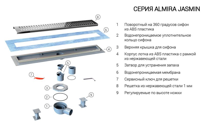 Комплектация: поворотный сифон 360 градусов из ABS-пластика, дренажный канал из ABS-пластика, водонепроницаемые уплотнительные кольца, решетка и рамка из нержавеющей стали 1 мм, противозапаховый затвор, водонепроницаемая мембрана, пластиковый сервисный ключ, комплект регулируемых по высоте опор