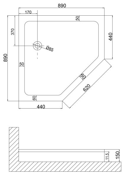 Душевой поддон NG-90-90D(90*90*15) трапеция, низкий Экран съемный.Сифон с системой clik-clack и гидрозатвором в комплекте