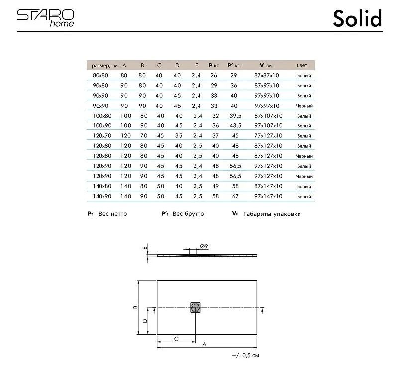 Душевой поддон Starohome Solid 90х90 BLACK MATT, 90 x 90 см, литьевой мрамор, квадратный, цвет черный матовыйДушевой поддон Solid изготовлен из литиевого мрамора Sanydur® и представляет собой монолитный материал на 85% состоящий из мраморной крошки, минеральных пигментов и связывающего материала в виде полиэфирной смолы. Сверху материал покрывается гелевым слоем Gel Coat Покрытие Gel Coat - это прочный прозрачный, абсолютно непористый материал, защищающий материал поддона от загрязнений, перепада температур и УФ-излучения. Душевые поддоны Solid производятся на современном европейском оборудовании для европейского рынка. Контроль качества осуществляется на всех этапах производства.