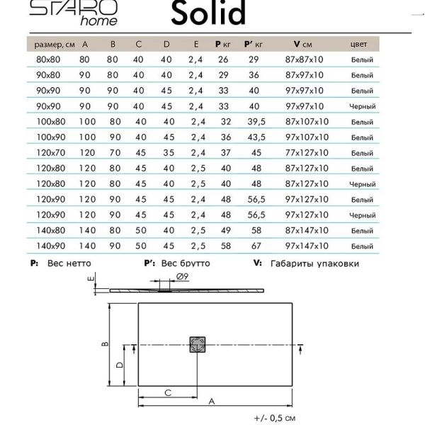Душевой поддон Starohome Solid 100х80, литьевой мрамор, прямоугольный, цвет серый матовыйИзготовлен из литиевого мрамора Sanydur® и представляет собой монолитный материал на 85% состоящий из мраморной крошки, минеральных пигментов и связывающего материала в виде полиэфирной смолы. Сверху материал покрывается гелевым слоем Gel Coat.Покрытие Gel Coat - это прочный прозрачный, абсолютно непористый материал, защищающий материал поддона от загрязнений, перепада температур и УФ-излучения. Душевые поддоны Solid производятся на современном европейском оборудовании для европейского рынка. Контроль качества осуществляется на всех этапах производства.