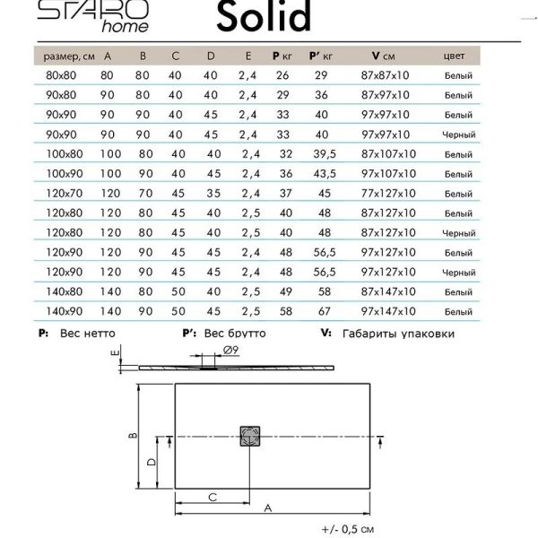 Душевой поддон Starohome Solid 100х90, литьевой мрамор, прямоугольный, цвет чёрный матовыйИзготовлен из литиевого мрамора Sanydur® и представляет собой монолитный материал на 85% состоящий из мраморной крошки, минеральных пигментов и связывающего материала в виде полиэфирной смолы. Сверху материал покрывается гелевым слоем Gel Coat.Покрытие Gel Coat - это прочный прозрачный, абсолютно непористый материал, защищающий материал поддона от загрязнений, перепада температур и УФ-излучения. Душевые поддоны Solid производятся на современном европейском оборудовании для европейского рынка. Контроль качества осуществляется на всех этапах производства.