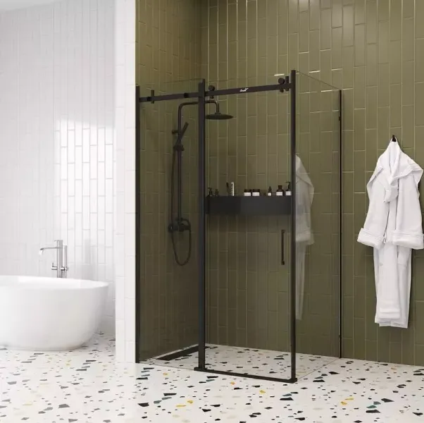 Раздвижная дверь с магнитным замком Soft close. В открытом состоянии створка не занимает полезную площадь в ванной. А магнитный замок обеспечивает плотное закрытие двери и предупреждает попадание воды на пол.