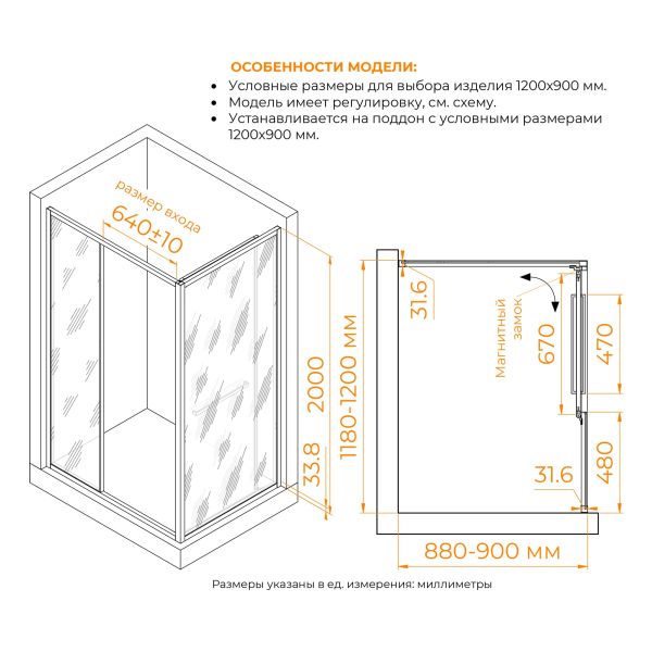 • Размеры (Д×Ш): 1000×800, 1000×900, 1200×800, 1200×900, 1200×1000 мм