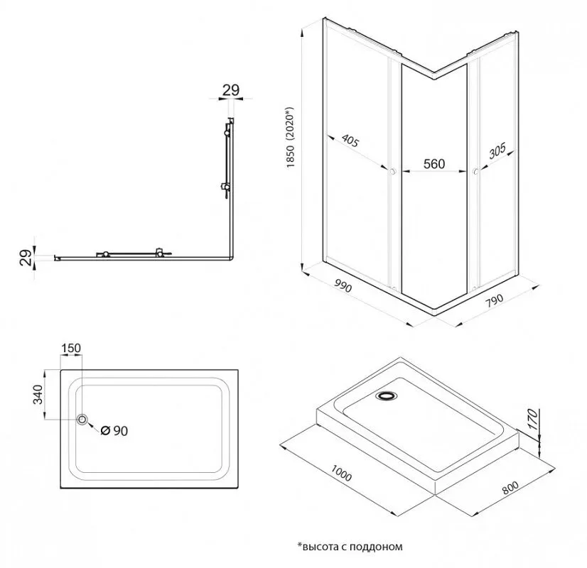 Высота с поддоном: 202 см