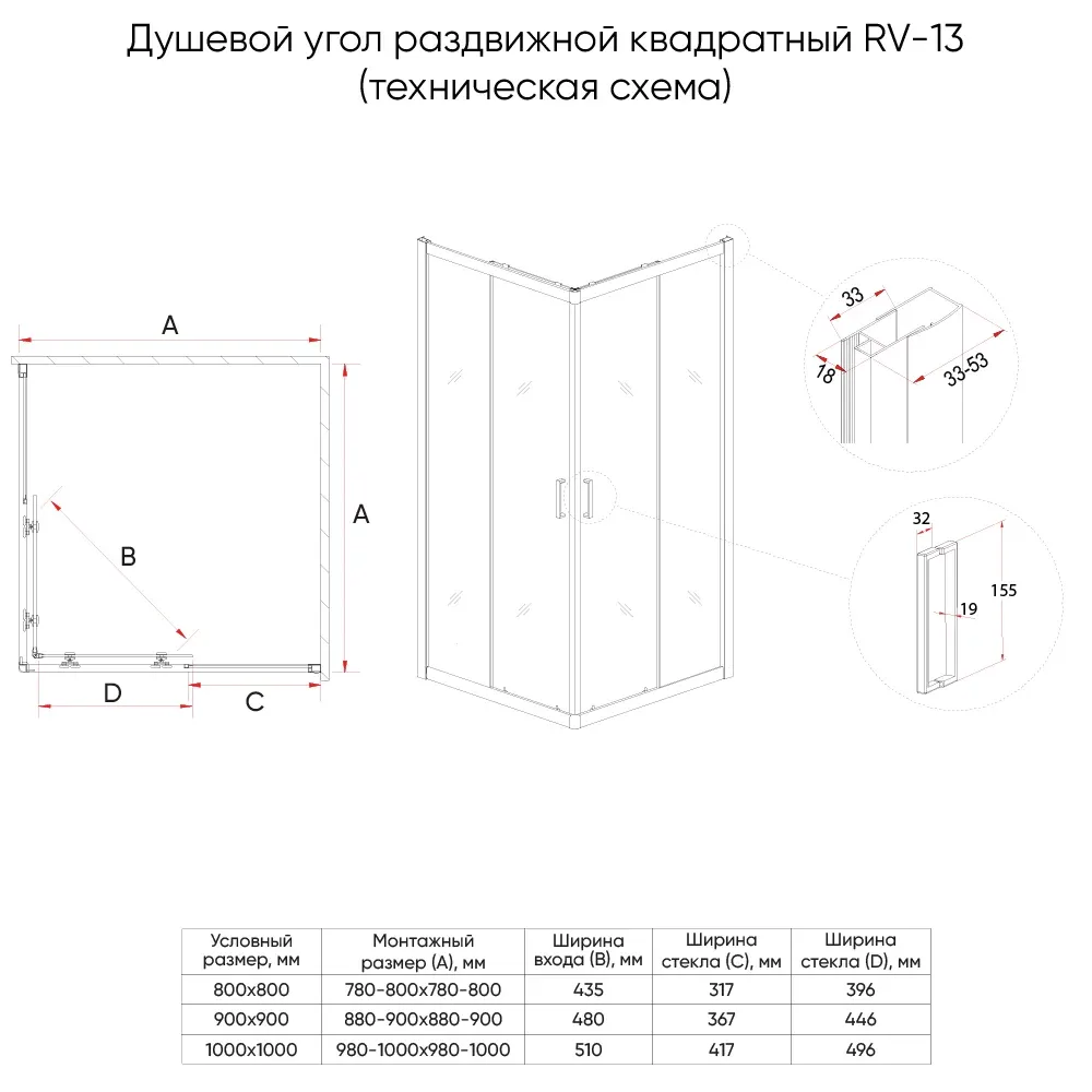 Душевой уголок Veconi Rovigo RV-13, 1100x1100x1950, черный, стекло прозрачное купить