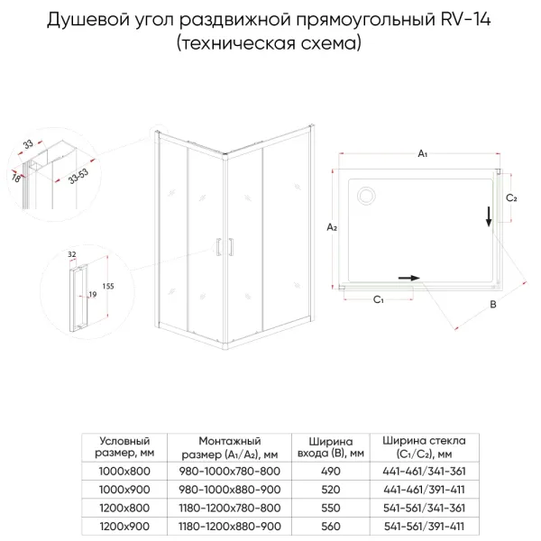 Душевой уголок Veconi Rovigo RV-14, 1000x900x1950, черный, стекло прозрачное купить