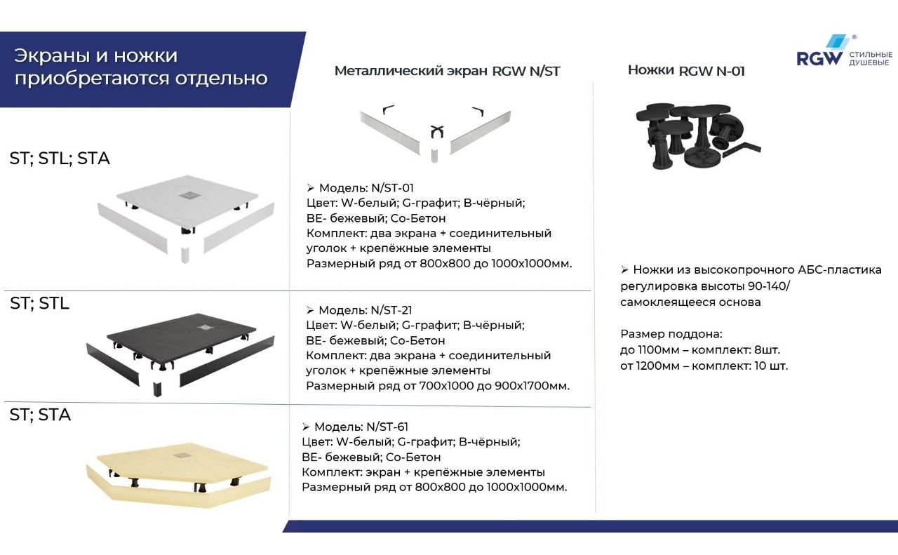 Рекомендованы ножки для поддона для установки экрана:
