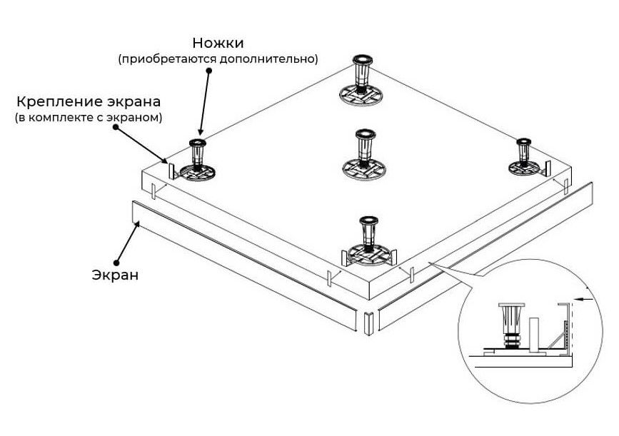 Комплектация: 2 экрана (фронтальный и боковой), соединительный уголок, крепление к ножкам на которые устанавливается поддон.