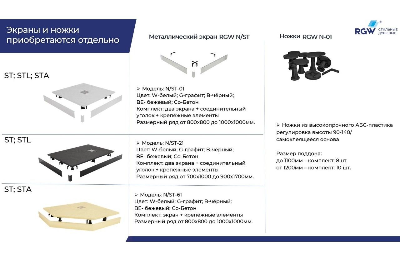 • Комплект из 10 шт. Ножки для поддона RGW N-10 Черные 03230111-31 (для поддонов длиной от 1200 мм включительно).