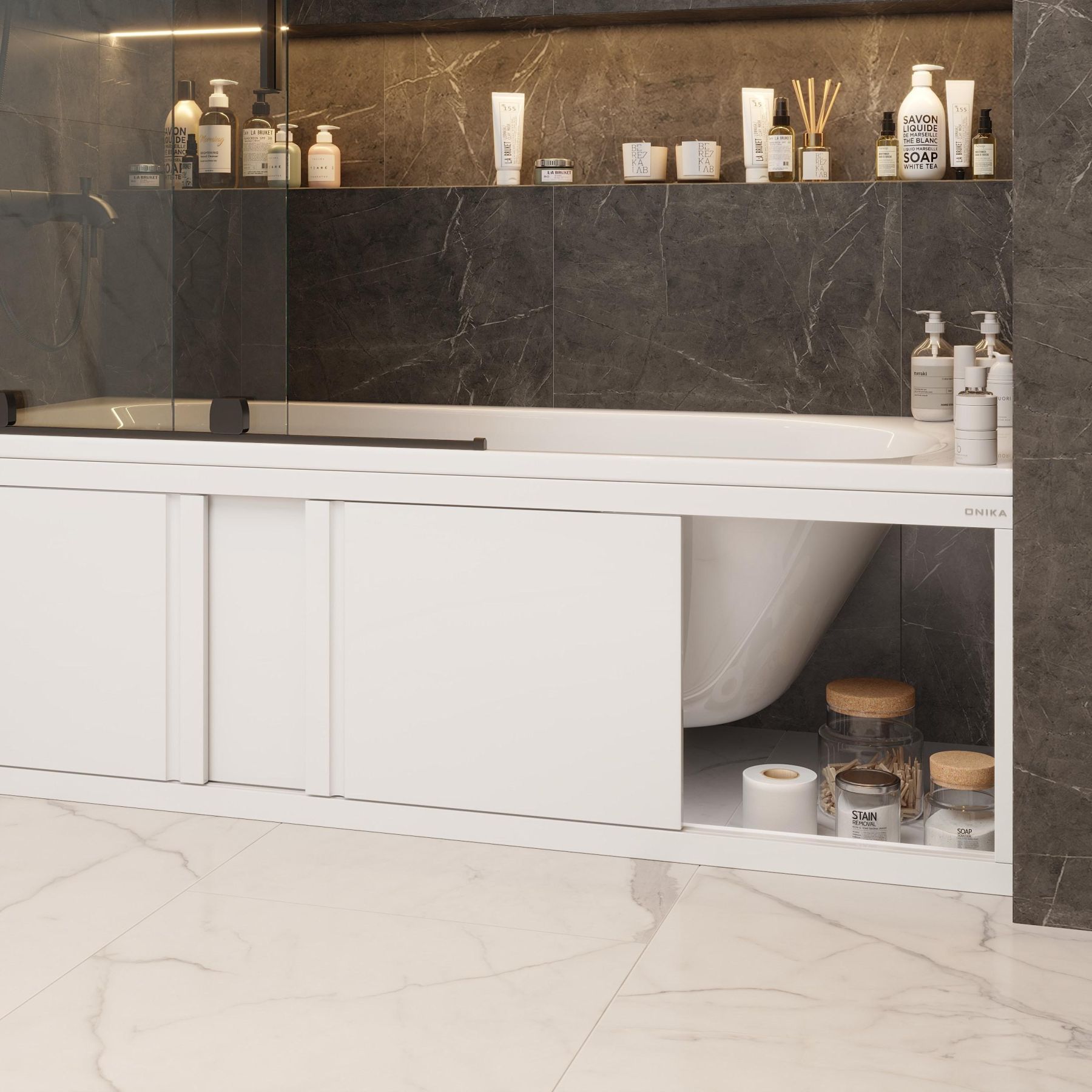 Универсальный экран под ванну 160 см Onika Одио скрывает все расположенные под ванной коммуникации и служит профилактикой скопления загрязнений под чашей ванны.