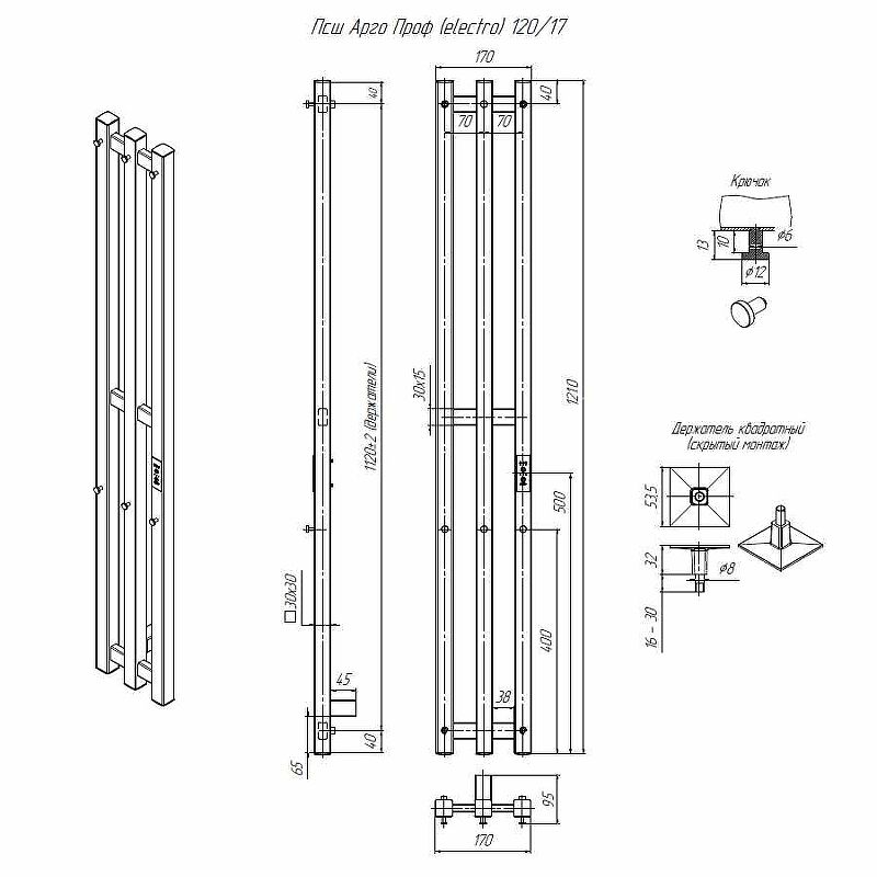 Электрический полотенцесушитель Altasan АргоПроф АргоПроф12017ЧМ Черный муарДанный полотенцесушитель имеет два вида подключения: подключение стандартным кабелем с вилкой 220 Вольт и скрытое подключение к заранее подведенной на месте установки проводке. Во втором случае необходимо обжать жилы проводки дополнительными клемниками(идут в комплекте) и подсоединить их к жилам полотенцесушителя, согласно цветовой разметки.