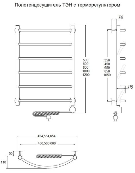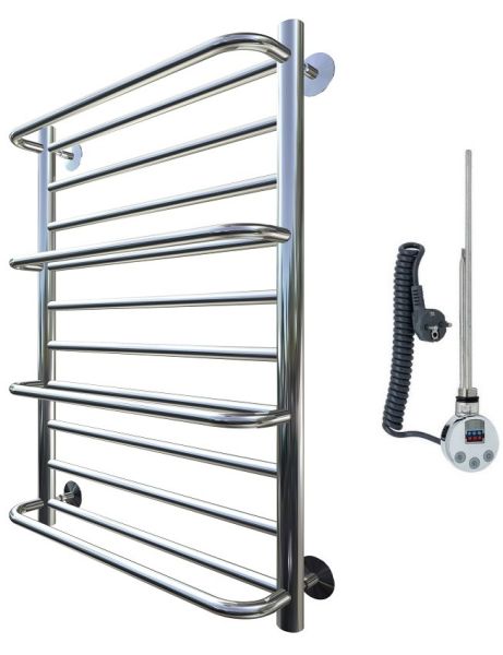 Внимание! Для скрытого монтажа электропроводки необходимо приобрести комплект скрытого подключения.Полотенцесушитель электрический комплектуется ТЭНом с терморегулятором и таймером.Изделие производится из нержавеющей стали AISI 201. Вертикальные трубы d -32 мм., для горизонтальных вставок используется труба d — 18 мм.Нагревательным элементом в полотенцесушителе является ТЭН. Полотенцесушитель заполнен бытовым антифризомЭкономичность: ТЭН нагревает антифриз до нужной температуры и выключается, далее при остывании полотенцесушителя он включается опять. Таким образом он работает не постоянно и получается, что ТЭН потребляет электричество не 300 Вт, а порядка 100 — 150 ВтМощность электрического прибора порядка 100 Вт при стоимости 1 Вт — 5 руб несложно посчитать: 100Вт х 24 = 2,4 кВт в сутки. Стоимость эксплуатации изделия за сутки 2,4 кВт х 5 руб. = 12 руб. При максимальной температуре расход электричества за 30 дней составит порядка 360 руб. При условии если сушка работает круглосуточно на максимальной температуре.Удобство монтажа: Полотенцесушитель крепится к стене на четыре держателя. Изначально ТЭН не установлен в полотенцесушитель для безопасной транспортировки, его можно установить, как справа, так и слева предварительно перевернув полотенцесушитель вверх ногами и выкрутив заглушку с нужной стороны на место в которое установится ТЭН.Примечание. Внимательно изучите инструкцию по установке ТЭНа!Скрытое подключение: Для скрытого монтажа электропроводки необходимо приобрести комплект скрытого подключения.Подключение в розетку: В комплекте с ТЭНом имеется шнур с вилкой, который будет необходим при подключении к розетке.