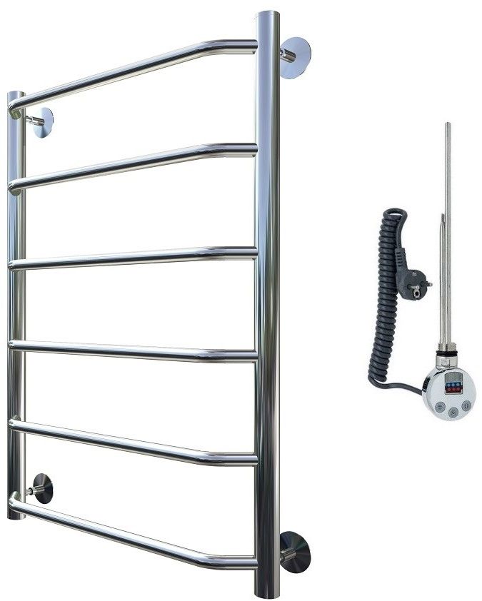 Внимание! Для скрытого монтажа электропроводки необходимо приобрести комплект скрытого подключения. Полотенцесушитель электрический комплектуется ТЭНом с терморегулятором и таймером. Изделие производится из нержавеющей стали AISI 201. Вертикальные трубы d -32 мм., для горизонтальных вставок используется труба d — 18 мм. Нагревательным элементом в полотенцесушителе является ТЭН. Полотенцесушитель заполнен бытовым антифризом.Экономичность: ТЭН нагревает антифриз до нужной температуры и выключается, далее при остывании полотенцесушителя он включается опять. Таким образом он работает не постоянно, и получается, что ТЭН потребляет электричество не 300 Вт, а порядка 100 — 150 Вт.Мощность электрического прибора порядка 100 Вт при стоимости 1 Вт — 5 руб несложно посчитать: 100Вт х 24 = 2,4 кВт в сутки. Стоимость эксплуатации изделия за сутки 2,4 кВт х 5 руб. = 12 руб. При максимальной температуре расход электричества за 30 дней составит порядка 360 руб. При условии если сушка работает круглосуточно на максимальной температуре.Удобство монтажа: Полотенцесушитель крепится к стене на четыре держателя. Изначально ТЭН не установлен в полотенцесушитель для безопасной транспортировки, его можно установить, как справа, так и слева предварительно перевернув полотенцесушитель вверх ногами и выкрутив заглушку с нужной стороны на место в которое установится ТЭН.Примечание. Внимательно изучите инструкцию по установке ТЭНа!Скрытое подключение: Для скрытого монтажа электропроводки необходимо приобрести комплект скрытого подключения.Подключение в розетку: В комплекте с ТЭНом имеется шнур с вилкой, который будет необходим при подключении к розетке.