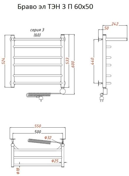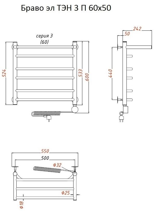Внимание! Для скрытого монтажа электропроводки необходимо приобрести комплект скрытого подключения. Полотенцесушитель электрический комплектуется ТЭНом с терморегулятором и таймером. Изделие производится из нержавеющей стали AISI 201. Вертикальные трубы d -32 мм., для горизонтальных вставок используется труба d — 18 мм. Нагревательным элементом в полотенцесушителе является ТЭН. Полотенцесушитель заполнен бытовым антифризом.Экономичность: ТЭН нагревает антифриз до нужной температуры и выключается, далее при остывании полотенцесушителя он включается опять. Таким образом он работает не постоянно, и получается, что ТЭН потребляет электричество не 300 Вт, а порядка 100 — 150 Вт.Мощность электрического прибора порядка 100 Вт при стоимости 1 Вт — 5 руб несложно посчитать: 100Вт х 24 = 2,4 кВт в сутки. Стоимость эксплуатации изделия за сутки 2,4 кВт х 5 руб. = 12 руб. При максимальной температуре расход электричества за 30 дней составит порядка 360 руб. При условии если сушка работает круглосуточно на максимальной температуре.Удобство монтажа: Полотенцесушитель крепится к стене на четыре держателя. Изначально ТЭН не установлен в полотенцесушитель для безопасной транспортировки, его можно установить, как справа, так и слева предварительно перевернув полотенцесушитель вверх ногами и выкрутив заглушку с нужной стороны на место в которое установится ТЭН.Примечание. Внимательно изучите инструкцию по установке ТЭНа!Скрытое подключение: Для скрытого монтажа электропроводки необходимо приобрести комплект скрытого подключения.Подключение в розетку: В комплекте с ТЭНом имеется шнур с вилкой, который будет необходим при подключении к розетке.