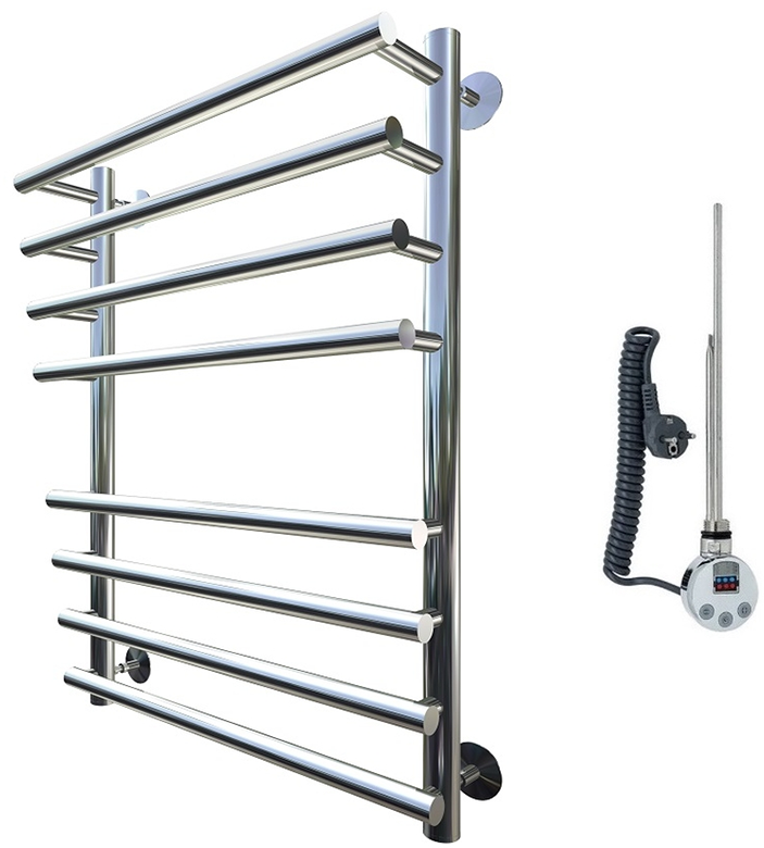 Внимание! Для скрытого монтажа электропроводки необходимо приобрести комплект скрытого подключения. Полотенцесушитель электрический комплектуется ТЭНом с терморегулятором и таймером. Изделие производится из нержавеющей стали AISI 201. Вертикальные трубы d -32 мм., для горизонтальных вставок используется труба d — 18 мм. Нагревательным элементом в полотенцесушителе является ТЭН. Полотенцесушитель заполнен бытовым антифризом.Экономичность: ТЭН нагревает антифриз до нужной температуры и выключается, далее при остывании полотенцесушителя он включается опять. Таким образом он работает не постоянно, и получается, что ТЭН потребляет электричество не 300 Вт, а порядка 100 — 150 Вт.Мощность электрического прибора порядка 100 Вт при стоимости 1 Вт — 5 руб несложно посчитать: 100Вт х 24 = 2,4 кВт в сутки. Стоимость эксплуатации изделия за сутки 2,4 кВт х 5 руб. = 12 руб. При максимальной температуре расход электричества за 30 дней составит порядка 360 руб. При условии если сушка работает круглосуточно на максимальной температуре.Удобство монтажа: Полотенцесушитель крепится к стене на четыре держателя. Изначально ТЭН не установлен в полотенцесушитель для безопасной транспортировки, его можно установить, как справа, так и слева предварительно перевернув полотенцесушитель вверх ногами и выкрутив заглушку с нужной стороны на место в которое установится ТЭН.Примечание. Внимательно изучите инструкцию по установке ТЭНа!Скрытое подключение: Для скрытого монтажа электропроводки необходимо приобрести комплект скрытого подключения.Подключение в розетку: В комплекте с ТЭНом имеется шнур с вилкой, который будет необходим при подключении к розетке.