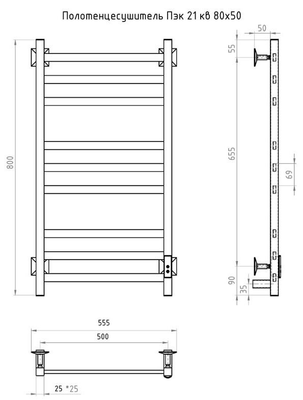 ПЭК — Полотенцесушитель электрический кабельный. Изделие производится из нержавеющей стали AISI 201. Вертикальные трубы d -32 мм., для горизонтальных вставок используется труба d — 18 мм.Нагревательным элементом в полотенцесушителе является греющий кабель — аналог «теплого пола», кабель заправляется внутрь каждой трубы и передает тепло на поверхность изделия. Во включенном состоянии постоянно поддерживается температура 50-600.Экономичность: Полотенцесушитель снабжен панелью управления. Кнопка включения/выключения и таймер на 2 часа и 4 часа, который позволяет включать изделие на ограниченное время. Эта функция дает возможность экономить электричество.Мощность электрического прибора порядка 60W при стоимости 1 кВт — 5 руб несложно посчитать: 60W х 24 = 1,5 кВт в сутки. Стоимость эксплуатации изделия за сутки 1,5 кВт х 5 руб. = 7,5 руб. Максимальный расход электричества за месяц примерно 225 руб. При условии если сушка работает круглосуточно.Удобство монтажа: Полотенцесушитель крепится к стене на четыре держателя. Универсальное исполнение изделия позволяет подключить его, как справа, так и слева.Скрытое подключение: Благодаря приваренным в нижней части вертикальных труб двум распаячным коробкам, в которых соединяется электропроводка, возможно скрытое подключение к электричеству слева и справа.Подключение в розетку: В комплекте также имеется шнур с вилкой, который будет необходим при подключении к розетке.Панель включения:РЕЖИМ №1 — постоянный нагревРЕЖИМ №2 — работа в течение 2 часов с последующим отключением.РЕЖИМ №3 — работа в течение 4 часов с последующим отключением.