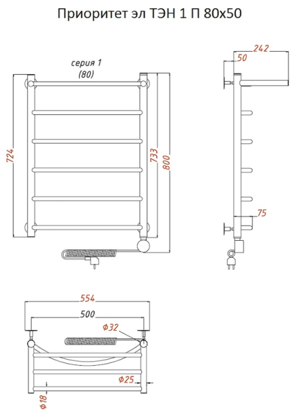 Внимание! Для скрытого монтажа электропроводки необходимо приобрести комплект скрытого подключения.Полотенцесушитель электрический комплектуется ТЭНом с терморегулятором и таймером.Изделие производится из нержавеющей стали AISI 201. Вертикальные трубы d -32 мм., для горизонтальных вставок используется труба d — 18 мм.Нагревательным элементом в полотенцесушителе является ТЭН. Полотенцесушитель заполнен бытовым антифризомЭкономичность: ТЭН нагревает антифриз до нужной температуры и выключается, далее при остывании полотенцесушителя он включается опять. Таким образом он работает не постоянно и получается, что ТЭН потребляет электричество не 300 Вт, а порядка 100 — 150 ВтМощность электрического прибора порядка 100 Вт при стоимости 1 Вт — 5 руб несложно посчитать: 100Вт х 24 = 2,4 кВт в сутки. Стоимость эксплуатации изделия за сутки 2,4 кВт х 5 руб. = 12 руб. При максимальной температуре расход электричества за 30 дней составит порядка 360 руб. При условии если сушка работает круглосуточно на максимальной температуре.Удобство монтажа: Полотенцесушитель крепится к стене на четыре держателя. Изначально ТЭН не установлен в полотенцесушитель для безопасной транспортировки, его можно установить, как справа, так и слева предварительно перевернув полотенцесушитель вверх ногами и выкрутив заглушку с нужной стороны на место в которое установится ТЭН.Примечание. Внимательно изучите инструкцию по установке ТЭНа!Скрытое подключение: Для скрытого монтажа электропроводки необходимо приобрести комплект скрытого подключения.Подключение в розетку: В комплекте с ТЭНом имеется шнур с вилкой, который будет необходим при подключении к розетке.