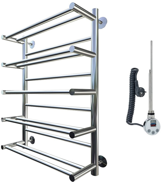 Внимание! Для скрытого монтажа электропроводки необходимо приобрести комплект скрытого подключения.Полотенцесушитель электрический комплектуется ТЭНом с терморегулятором и таймером.Изделие производится из нержавеющей стали AISI 201. Вертикальные трубы d -32 мм., для горизонтальных вставок используется труба d — 18 мм.Нагревательным элементом в полотенцесушителе является ТЭН. Полотенцесушитель заполнен бытовым антифризомЭкономичность: ТЭН нагревает антифриз до нужной температуры и выключается, далее при остывании полотенцесушителя он включается опять. Таким образом он работает не постоянно и получается, что ТЭН потребляет электричество не 300 Вт, а порядка 100 — 150 ВтМощность электрического прибора порядка 100 Вт при стоимости 1 Вт — 5 руб несложно посчитать: 100Вт х 24 = 2,4 кВт в сутки. Стоимость эксплуатации изделия за сутки 2,4 кВт х 5 руб. = 12 руб. При максимальной температуре расход электричества за 30 дней составит порядка 360 руб. При условии если сушка работает круглосуточно на максимальной температуре.Удобство монтажа: Полотенцесушитель крепится к стене на четыре держателя. Изначально ТЭН не установлен в полотенцесушитель для безопасной транспортировки, его можно установить, как справа, так и слева предварительно перевернув полотенцесушитель вверх ногами и выкрутив заглушку с нужной стороны на место в которое установится ТЭН.Примечание. Внимательно изучите инструкцию по установке ТЭНа!Скрытое подключение: Для скрытого монтажа электропроводки необходимо приобрести комплект скрытого подключения.Подключение в розетку: В комплекте с ТЭНом имеется шнур с вилкой, который будет необходим при подключении к розетке.