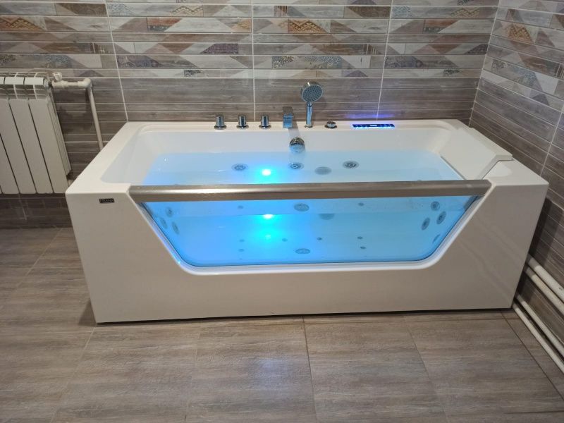 Все гидромассажные ванны Frank поставляются в максимальной комплектации и имеют множества функций. Ванна с гидромассажем Frank F102 пристенная, прямоугольная с аэромассажем,гидромассажем,турбомассажем. В боковой стенке установлен многоцветный подводный фонарь. Также ванна снабжена системой дезинфекции. Форсунки расположены в ванне с учётом эргономики тела и способствуют максимальному охвату поверхности тела при работе аэро- и гидромассажных двигателей. Вся ванна сделана из литьевого акрила. Передний и боковые экраны сделаны единой конструкцией с ванной. Стоит система слива остатков воды из форсунков. Лицевая стенка изготовлена из 10мм закалённого стекла.