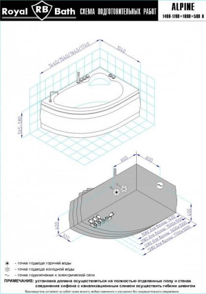 Акриловая ванна Royal Bath - идеальный выбор для создания атмосферы релакса и умиротворения, как в просторной в ванной комнате, так и в комнатном санузле. Основным преимуществом ванны из акрила считается её малый вес, высокая гигиеничность данного материала и низкая теплопроводность, долго сохраняющая комфортную температуру воды.Форма ванны Royal Bath замечательно подойдет к любому интерьерному решению, в различных вариантах размещения внутри ванной комнаты. Пристенная установка - это наиболее традиционный вид установки, а при использовании декоративного экрана пространство под ванной можно использовать как место хранения моющих средств. Оптимальная глубина позволяет принимать ванну с максимальным комфортом и полным расслаблением. Ванна Royal Bath выполнена со строгим соблюдением всех значительных элементов современного стиля.Благодаря тому, что родина бренда Royal Bath - Россия, можно смело быть уверенным в непревзойденном качестве и долговечности ванны, так как производство полностью соответствует стандартам качества. Акриловая ванна Royal Bath - это незаменимый, основной элемент любой ванной комнаты, без которого невозможно обойтись, ни в многоквартирном доме, ни в загородном коттедже.Комплектация гидромассажной ванны:- акриловая ванна Alpine 160x100x58;- каркас сварной к ванне Alpine 160;- панель к ванне Alpine 160;- гидромассажная система на 6 форсунок;- спинной массаж на 6 форсунок;- аэромассаж с хромотерапией 8 форсунок;- слив-перелив для ванны полуавтомат 60 см.Ожидаемый срок поставки 7 дней.Обратите внимание: данная позиция поставляется под заказ! Товар поставляется по 100%-ной предоплате.Данный товар является заказным и имеет индивидуально-определенные свойства.