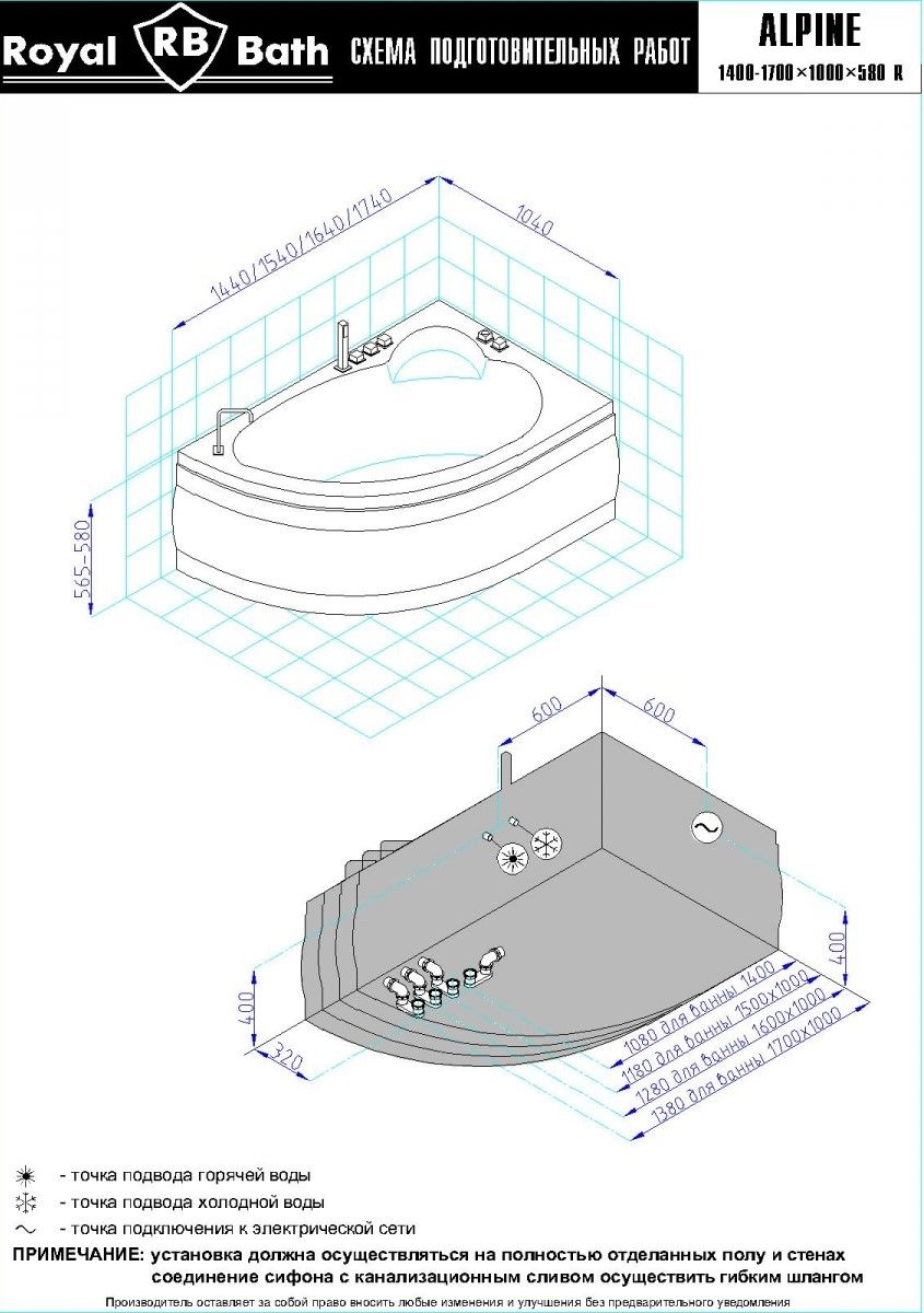 Акриловая ванна Royal Bath - идеальный выбор для создания атмосферы релакса и умиротворения, как в просторной в ванной комнате, так и в комнатном санузле. Основным преимуществом ванны из акрила считается её малый вес, высокая гигиеничность данного материала и низкая теплопроводность, долго сохраняющая комфортную температуру воды.Форма ванны Royal Bath замечательно подойдет к любому интерьерному решению, в различных вариантах размещения внутри ванной комнаты. Пристенная установка - это наиболее традиционный вид установки, а при использовании декоративного экрана пространство под ванной можно использовать как место хранения моющих средств. Оптимальная глубина позволяет принимать ванну с максимальным комфортом и полным расслаблением. Ванна Royal Bath выполнена со строгим соблюдением всех значительных элементов современного стиля.Благодаря тому, что родина бренда Royal Bath - Россия, можно смело быть уверенным в непревзойденном качестве и долговечности ванны, так как производство полностью соответствует стандартам качества. Акриловая ванна Royal Bath - это незаменимый, основной элемент любой ванной комнаты, без которого невозможно обойтись, ни в многоквартирном доме, ни в загородном коттедже.Комплектация гидромассажной ванны:- акриловая ванна Alpine 170x100x58;- каркас сварной к ванне Alpine 170;- панель к ванне Alpine 170;- гидромассажная система на 6 форсунок;- спинной массаж на 6 форсунок;- аэромассаж с хромотерапией 8 форсунок;- слив-перелив для ванны полуавтомат 60 см.Ожидаемый срок поставки 7 дней.Обратите внимание: данная позиция поставляется под заказ! Товар поставляется по 100%-ной предоплате.Данный товар является заказным и имеет индивидуально-определенные свойства.
