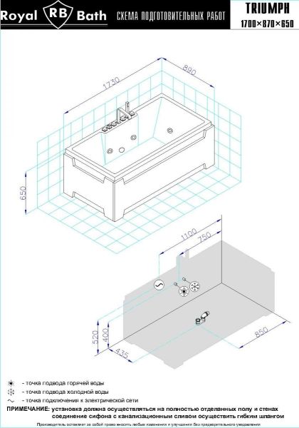 Акриловая ванна Royal Bath - идеальный выбор для создания атмосферы релакса и умиротворения, как в просторной в ванной комнате, так и в комнатном санузле. Основным преимуществом ванны из акрила считается её малый вес, высокая гигиеничность данного материала и низкая теплопроводность, долго сохраняющая комфортную температуру воды.Форма ванны Royal Bath замечательно подойдет к любому интерьерному решению, в различных вариантах размещения внутри ванной комнаты. Пристенная установка - это наиболее традиционный вид установки, а при использовании декоративного экрана пространство под ванной можно использовать как место хранения моющих средств. Оптимальная глубина позволяет принимать ванну с максимальным комфортом и полным расслаблением. Ванна Royal Bath выполнена со строгим соблюдением всех значительных элементов современного стиля.Благодаря тому, что родина бренда Royal Bath - Россия, можно смело быть уверенным в непревзойденном качестве и долговечности ванны, так как производство полностью соответствует стандартам качества. Акриловая ванна Royal Bath - это незаменимый, основной элемент любой ванной комнаты, без которого невозможно обойтись, ни в многоквартирном доме, ни в загородном коттедже.Комплектация гидромассажной ванны:- акриловая ванна Triumph 170х87х65 в сборе;- гидромассажная система на 6 форсунок;- cмеситель на борт ванны RB Triumph 501;- слив-перелив для ванны полуавтомат 60 см.Ожидаемый срок поставки 7 дней.Обратите внимание: данная позиция поставляется под заказ! Товар поставляется по 100%-ной предоплате.Данный товар является заказным и имеет индивидуально-определенные свойства.