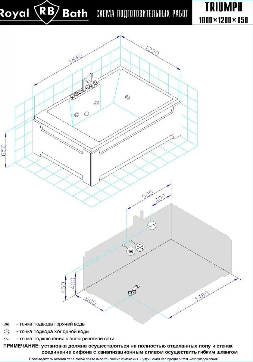 Акриловая ванна Royal Bath - идеальный выбор для создания атмосферы релакса и умиротворения, как в просторной в ванной комнате, так и в комнатном санузле. Основным преимуществом ванны из акрила считается её малый вес, высокая гигиеничность данного материала и низкая теплопроводность, долго сохраняющая комфортную температуру воды.Форма ванны Royal Bath замечательно подойдет к любому интерьерному решению, в различных вариантах размещения внутри ванной комнаты. Пристенная установка - это наиболее традиционный вид установки, а при использовании декоративного экрана пространство под ванной можно использовать как место хранения моющих средств. Оптимальная глубина позволяет принимать ванну с максимальным комфортом и полным расслаблением. Ванна Royal Bath выполнена со строгим соблюдением всех значительных элементов современного стиля.Благодаря тому, что родина бренда Royal Bath - Россия, можно смело быть уверенным в непревзойденном качестве и долговечности ванны, так как производство полностью соответствует стандартам качества. Акриловая ванна Royal Bath - это незаменимый, основной элемент любой ванной комнаты, без которого невозможно обойтись, ни в многоквартирном доме, ни в загородном коттедже.Комплектация гидромассажной ванны:- акриловая ванна Triumph 180х120х65 в сборе;- гидромассажная система на 8 форсунок (по 2 форсунки по бокам, 2 форсунки в ногах, 2 форсунки спина);- аэромассаж с хромотерапией на 16 форсунок;- cмеситель на борт ванны RB Triumph 501;- слив-перелив для ванны полуавтомат 60 см. Ожидаемый срок поставки 7 дней.Обратите внимание: данная позиция поставляется под заказ! Товар поставляется по 100%-ной предоплате.Данный товар является заказным и имеет индивидуально-определенные свойства.
