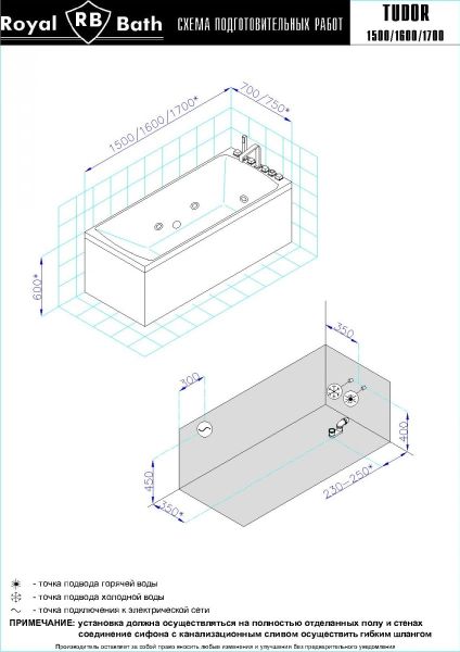 Акриловая ванна Royal Bath - идеальный выбор для создания атмосферы релакса и умиротворения, как в просторной в ванной комнате, так и в комнатном санузле. Основным преимуществом ванны из акрила считается её малый вес, высокая гигиеничность данного материала и низкая теплопроводность, долго сохраняющая комфортную температуру воды.Форма ванны Royal Bath замечательно подойдет к любому интерьерному решению, в различных вариантах размещения внутри ванной комнаты. Пристенная установка - это наиболее традиционный вид установки, а при использовании декоративного экрана пространство под ванной можно использовать как место хранения моющих средств. Оптимальная глубина позволяет принимать ванну с максимальным комфортом и полным расслаблением. Ванна Royal Bath выполнена со строгим соблюдением всех значительных элементов современного стиля.Благодаря тому, что родина бренда Royal Bath - Россия, можно смело быть уверенным в непревзойденном качестве и долговечности ванны, так как производство полностью соответствует стандартам качества. Акриловая ванна Royal Bath - это незаменимый, основной элемент любой ванной комнаты, без которого невозможно обойтись, ни в многоквартирном доме, ни в загородном коттедже.Комплектация гидромассажной ванны:- акриловая ванна Tudor 160x70x60;- каркас сварной к ванне Tudor 160;- панель фронтальная к ванне Tudor 160;- панель боковая Tudor/Vienna 70 L;- панель боковая Tudor/Vienna 70 R;- гидромассажная система на 6 форсунок;- слив-перелив для ванны полуавтомат 60 см.Ожидаемый срок поставки 7 дней.Обратите внимание: данная позиция поставляется под заказ! Товар поставляется по 100%-ной предоплате.Данный товар является заказным и имеет индивидуально-определенные свойства.