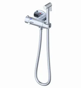 Смеситель встраиваемый Gappo G7290 с гигиеническим душем термостатический - изготовлен из латуни с хромированным покрытием. Комфортную и безопасную эксплуатацию обеспечивает термостат с ограничителем температуры 38°. Корпус смесителя оснащен держателем для гигиенической лейки и крючком для принадлежностей. Душевой шланг в комплекте.