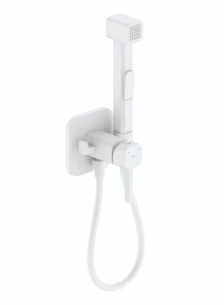Встраиваемый смеситель с гигиеническим душем со стильным белым матовым покрытием подойдет для современной туалетной комнаты, привнесет в нее комфорт и эстетику. Крючок на корпусе смесителя позволит разместить полотенце – оно будет всегда под рукой. Держатель для лейки и крючок для полотенца при необходимости можно поменять местами. Гигиеническая лейка и гладкий душевой шланг длиной 1,2 метра в комплекте.